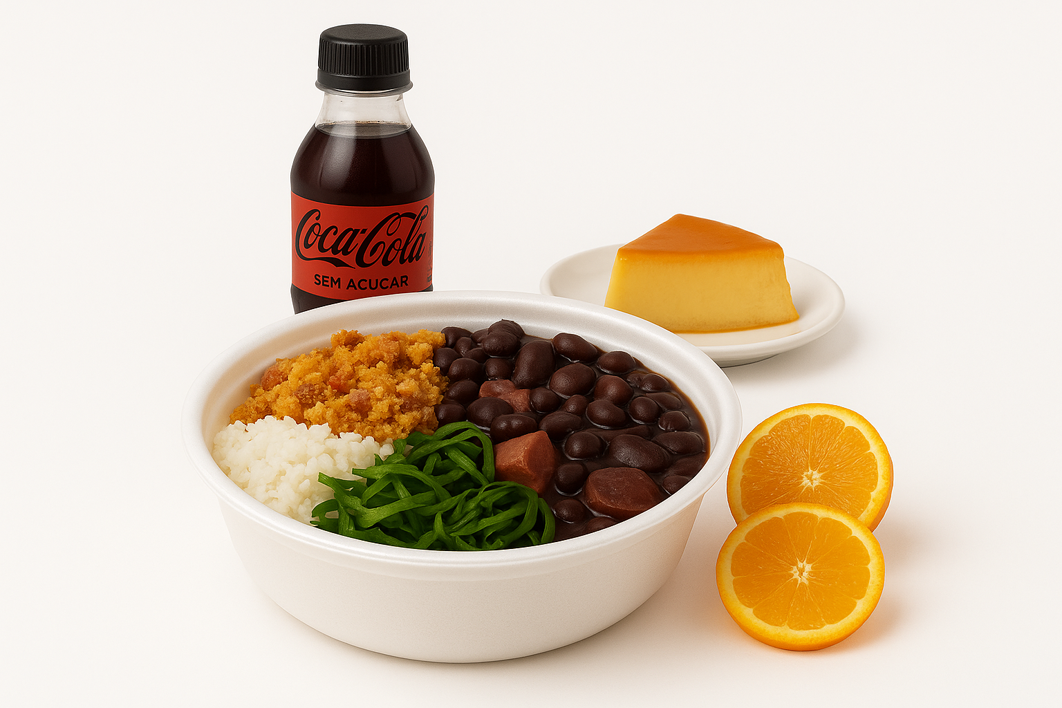 Combo com marmitex pequena (aprox. 450 gr) + Coca Cola 200 ml + Fatia de pudim de leite condensado (aprox. 110 gr).
